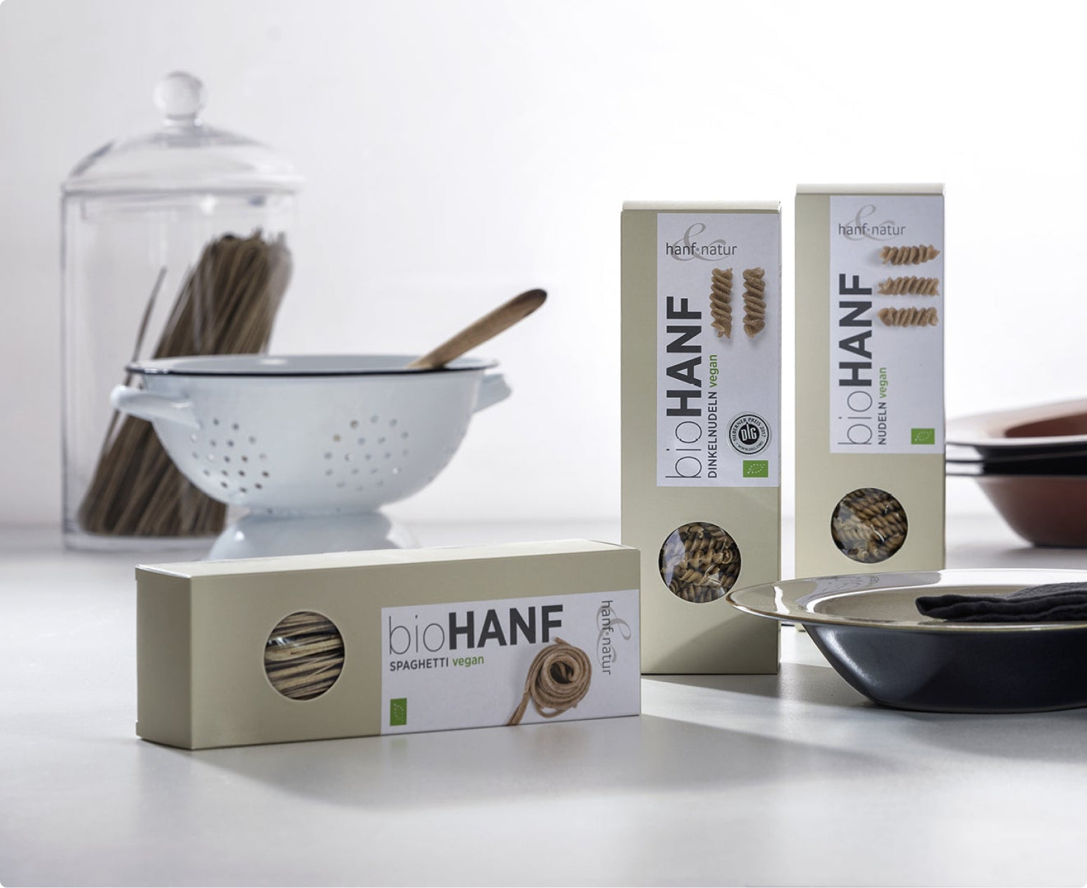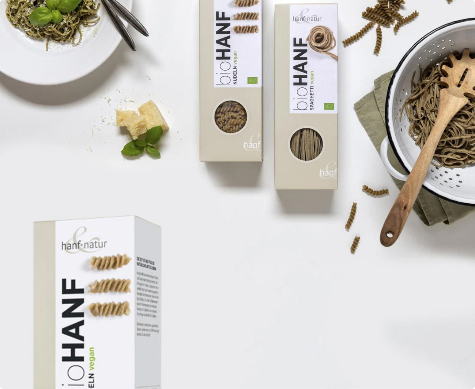 Die Hanf-Nudeln bestehen aus hochwertigem Hartweizen und Hanfmehl. Dadurch sind die Hanf-Nudeln sehr sättigend. Somit sind sie eine abwechslungsreiche Alternative zu herkömmlichen Nudeln.