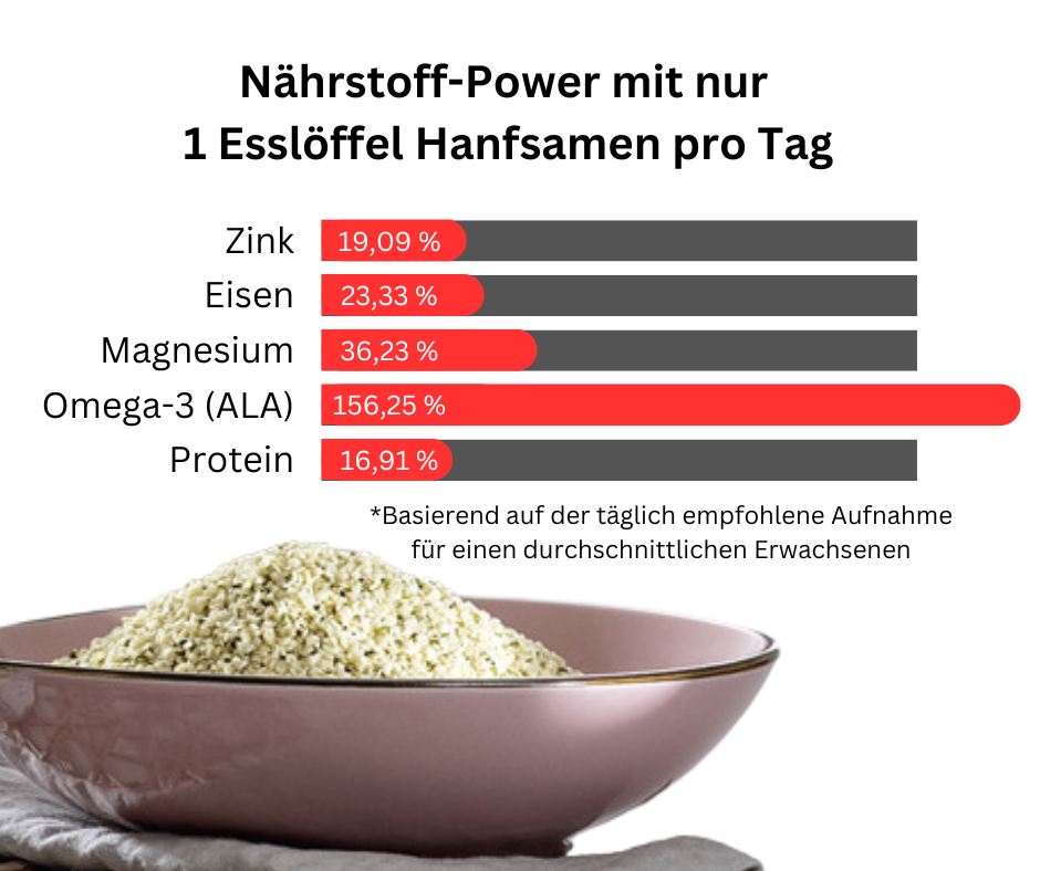 Unsere geschälten Hanfsamen sind ein wertvoller Lieferant von essentiellen Nährstoffen wie Proteinen, Omega-3- und Omega-6-Fettsäuren sowie wichtigen Mineralien und Vitaminen. Um die Vorteile dieser Superfood-Samen optimal zu nutzen, empfehlen wir eine Tagesdosis von max. 30 Gramm. Wie bei allen Nahrungsergänzungsmitteln raten wir dazu, bei besonderen gesundheitlichen Bedingungen oder wenn Sie eine größere Menge in Betracht ziehen, vorher einen Ernährungsberater oder Arzt zu konsultieren.
