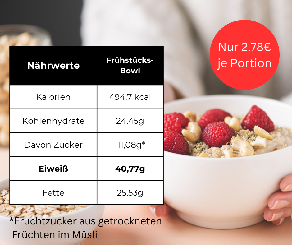 Mit diesem Frühstück hast du bereits deinen Bedarf an Eiweiß zu mind. 40% gedeckt (bei einem Eiweißbedarf von ca. 100g pro Tag). Bilde eine Basis, um jeden Tag deinen Proteinbedarf zu decken. Ganz ohne versteckte Geschmacksverstärker oder Zucker.