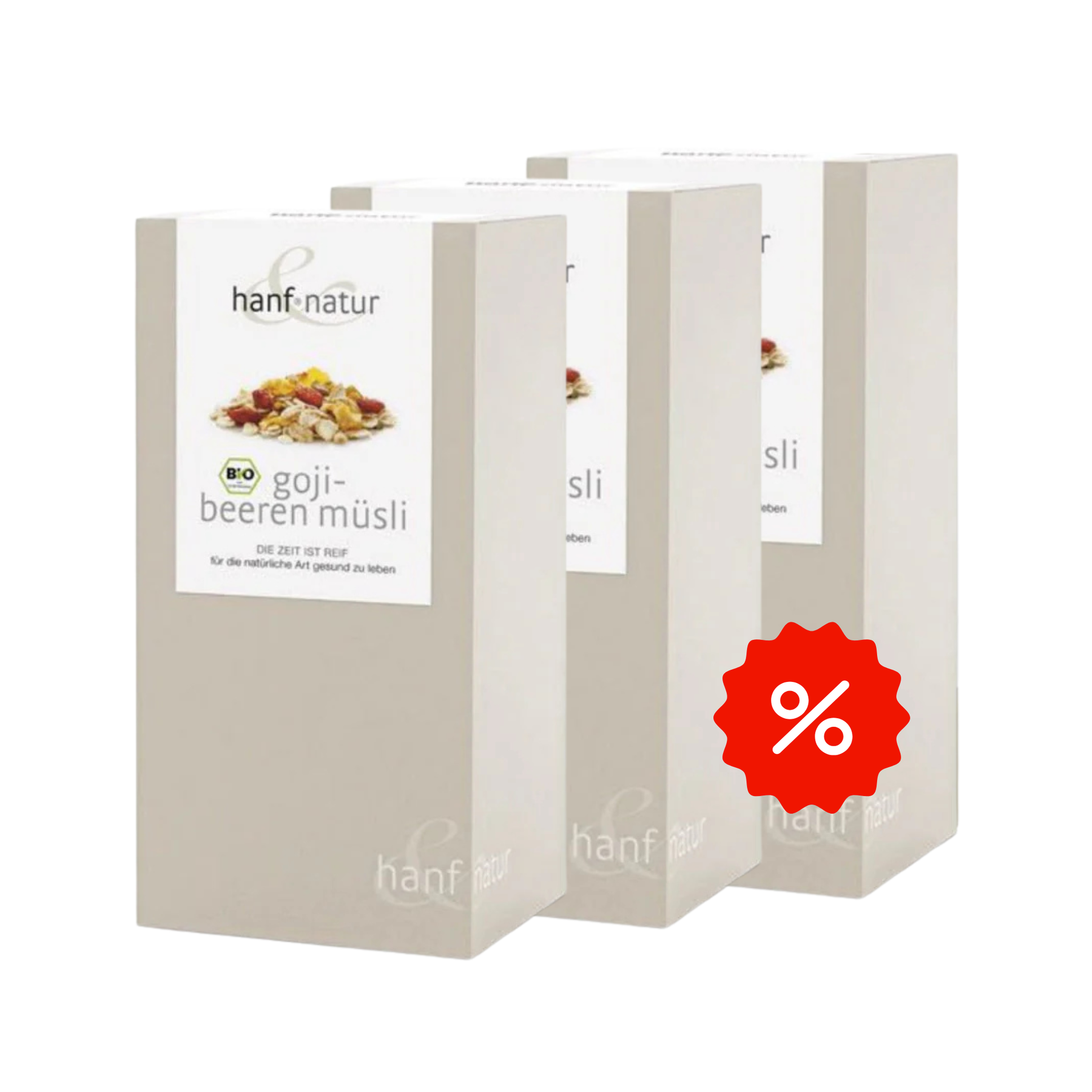 Hafer*, Gerste*, Dinkel*, Vollkornflakes*, Sonnenblumenkerne*, Goji-Beeren*, Cranberries*, Hanfsamen* geschält, Äpfel*.