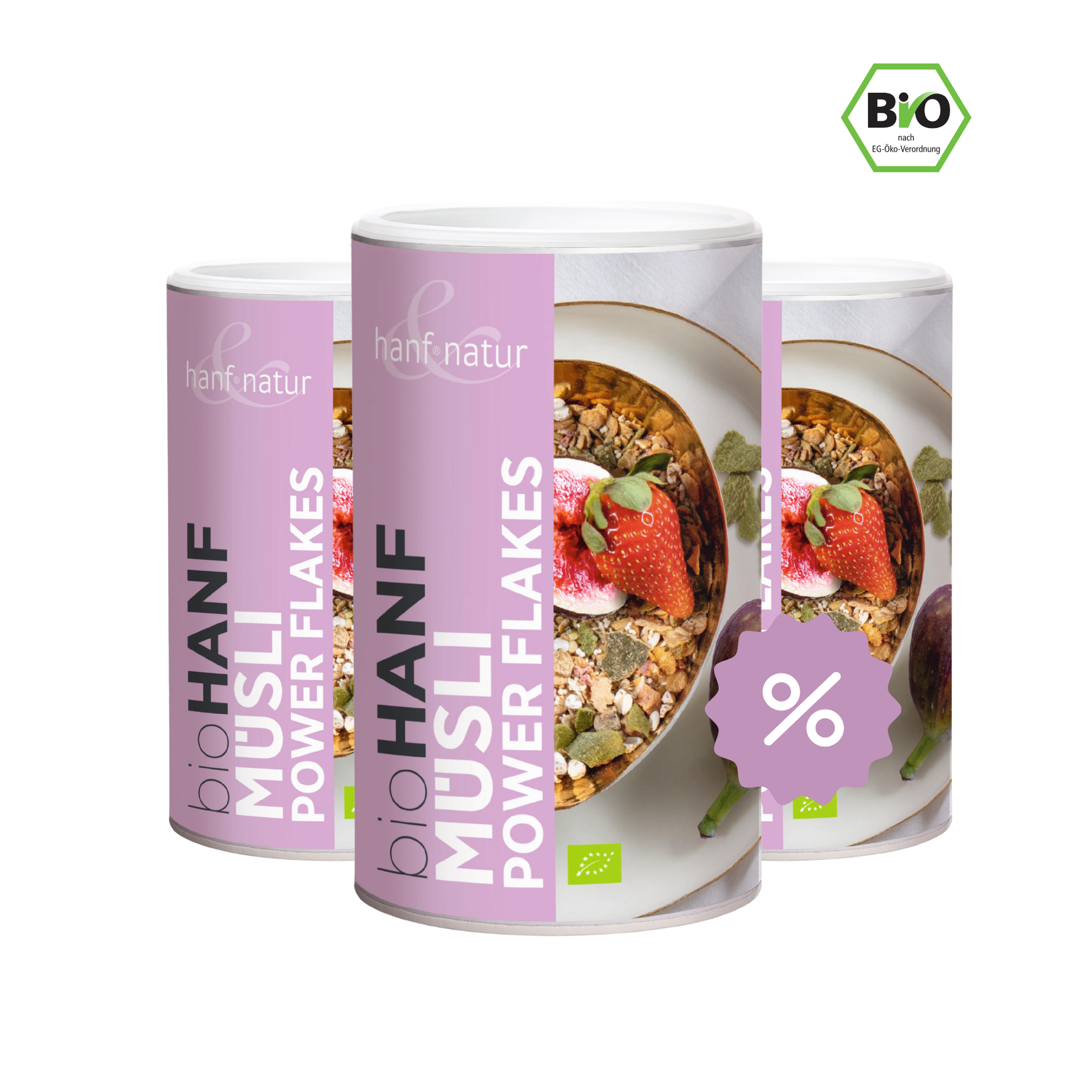 Sojaflocken* 30%, Hanfprotein Flakes* 15%, Gersteflocken* gekeimt 14%, Feigenstücke* (Feigen*, Reismehl*) 14%, Hanfsamen* geschält 7%, Buchweizen* gepufft, Buchweizen*, Amaranth* gepufft, Apfelstücke* getrocknet, Reisprotein* 3%, Himbeeren* gefriergetrocknet 1%, Erdbeeren* gefriergetrocknet 1%