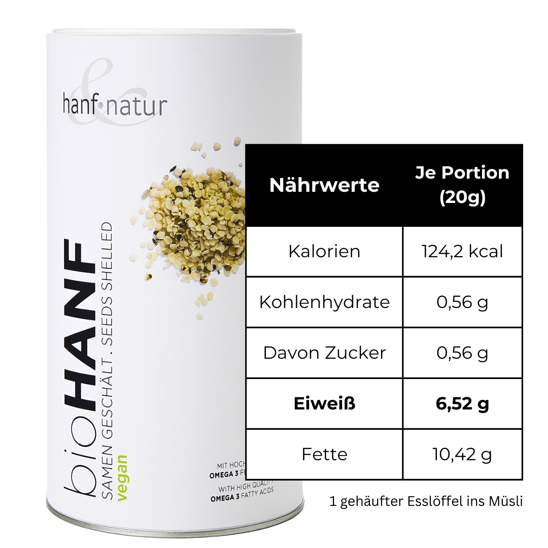 Unsere geschälten Hanfsamen sind ein wertvoller Lieferant von essentiellen Nährstoffen wie Proteinen, Omega-3- und Omega-6-Fettsäuren sowie wichtigen Mineralien und Vitaminen. Um die Vorteile dieser Superfood-Samen optimal zu nutzen, empfehlen wir eine Tagesdosis von max. 30 Gramm. Wie bei allen Nahrungsergänzungsmitteln raten wir dazu, bei besonderen gesundheitlichen Bedingungen oder wenn Sie eine größere Menge in Betracht ziehen, vorher einen Ernährungsberater oder Arzt zu konsultieren.